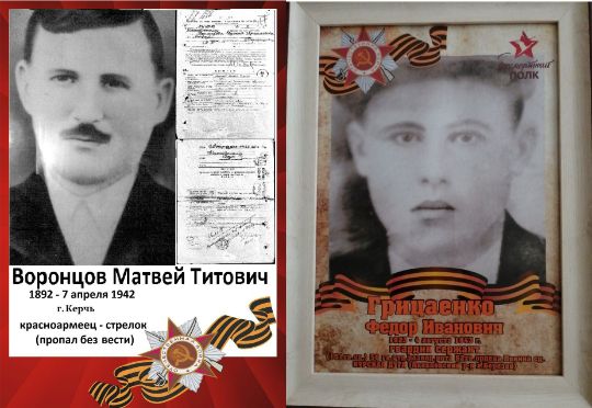Воронцов Матвей Титович в 1942г (в 50 лет) был призван в ряды Красной Армии, направлен в г. Керчь, где занимался подготовкой новобранцев. Почти сразу переписка с ним моей прабабушки прервалась из-за тяжелейшей обстановки в Крыму - шли ожесточенные бои. В 1946г был сделан запрос в военкомат о поиске красноармейца Воронцова Матвея Титовича, откуда пришел ответ : «Считать пропавшим без вести»… моя прабабушка Воронцова Евдокия так и жила надеждой, что муж может все таки найдется и придет с войны…